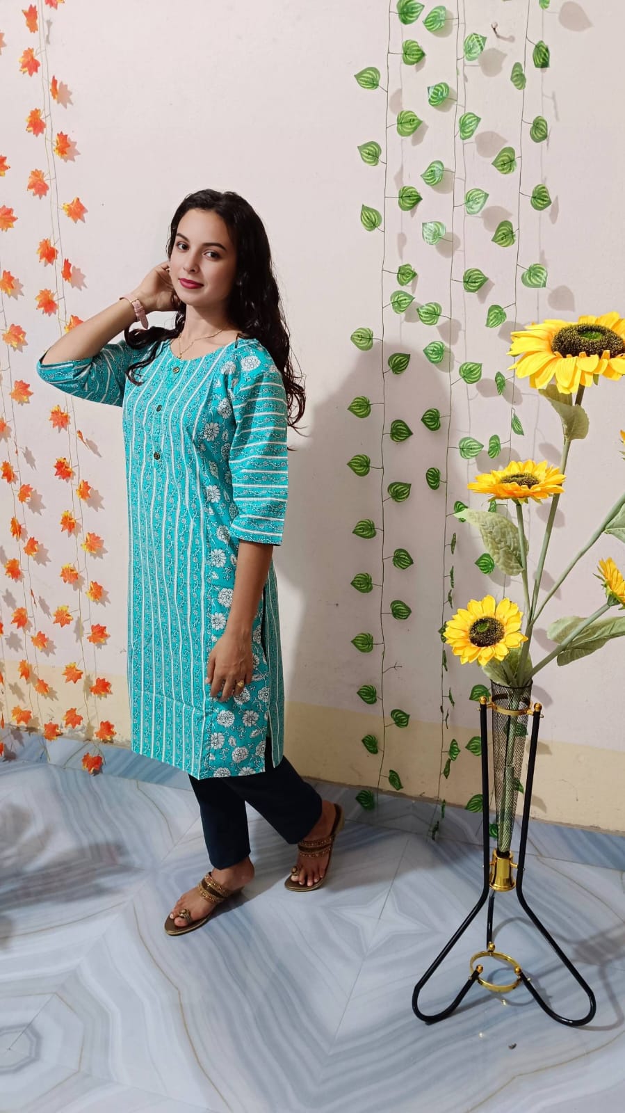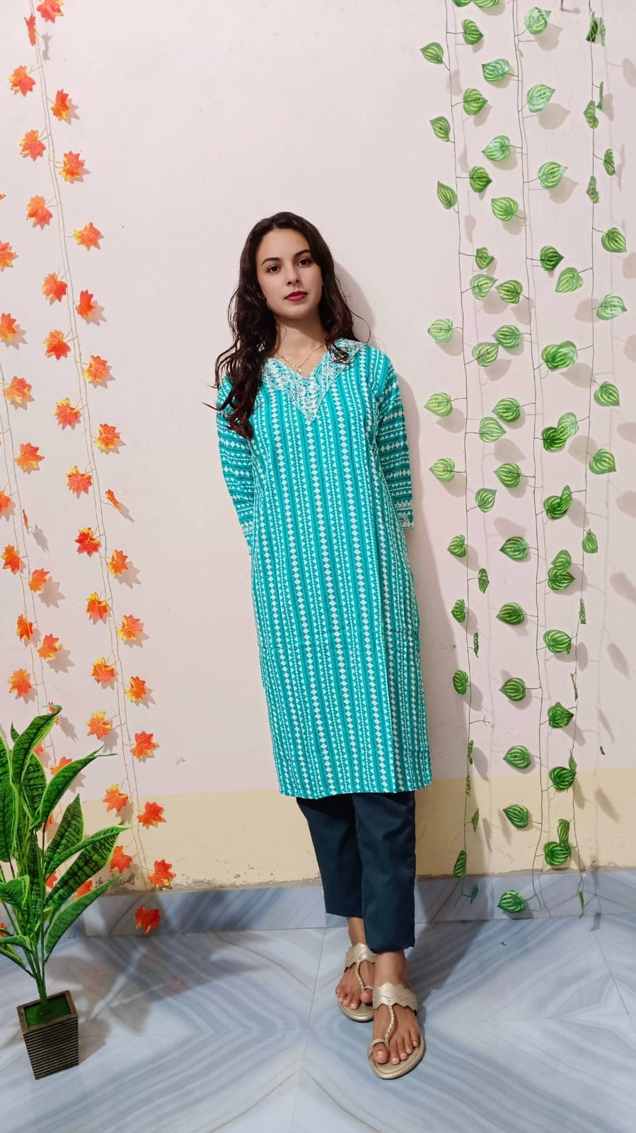 This Tunic Pant Co-ord Set combines comfort and style into one versatile outfit. The set features a long, straight-fit tunic with a V-neckline and three-quarter sleeves, designed with bold floral prints that add a vibrant touch. Paired with coordinating wide-leg pant, this set is made from soft, breathable fabric that ensures all-day comfort. Perfect for casual wear, lounging, or semi-formal occasions, it offers an effortless, coordinated look with the flexibility to mix and match with other wardrobe pieces. The set makes a chic and stylish addition to any ethnic or fusion wear collection. Hand wash recommended for maintaining quality and color vibrancy.