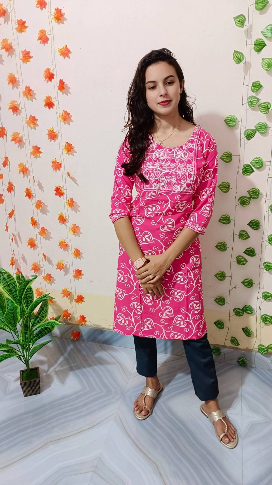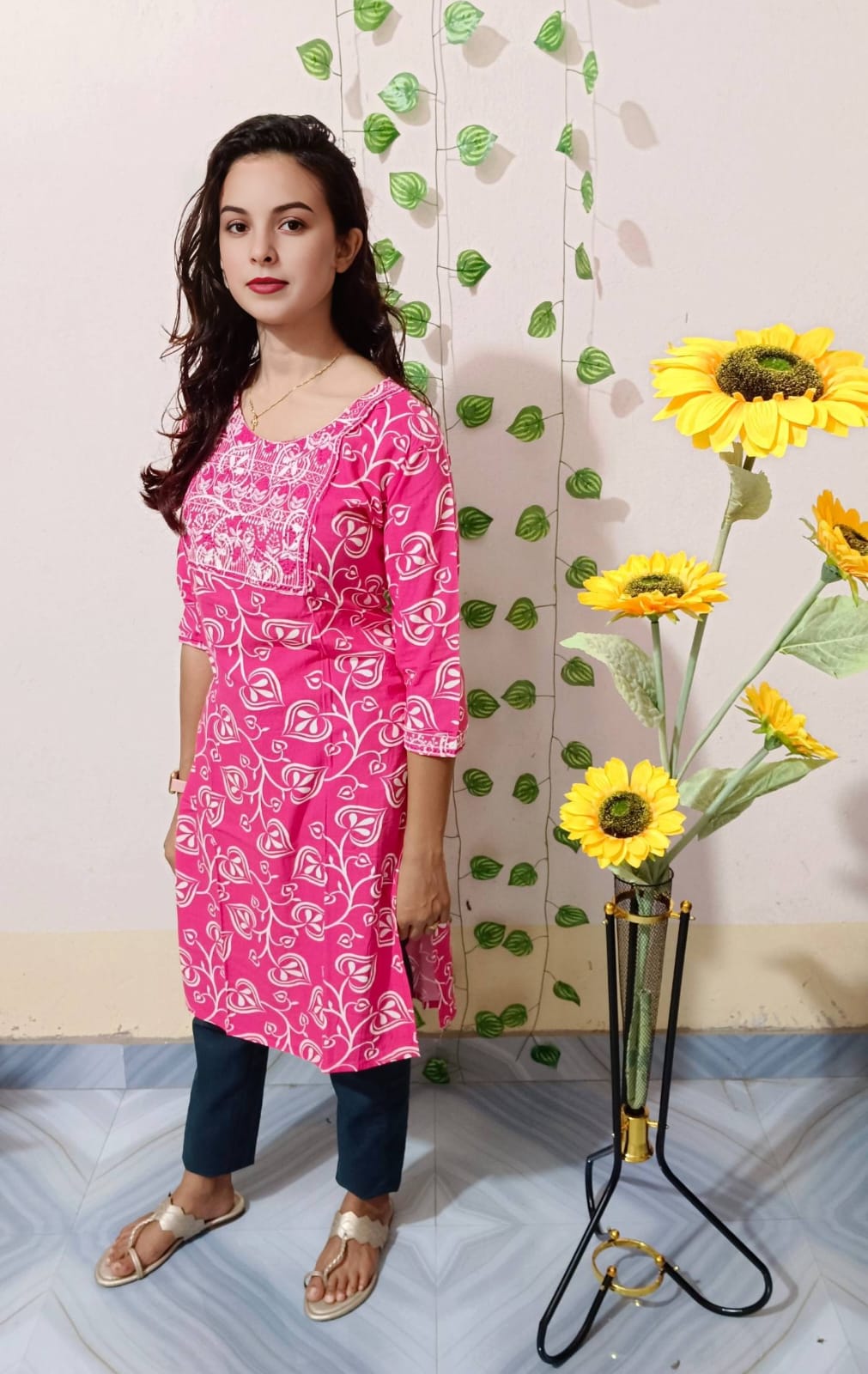 This Tunic Pant Co-ord Set combines comfort and style into one versatile outfit. The set features a long, straight-fit tunic with a V-neckline and three-quarter sleeves, designed with bold floral prints that add a vibrant touch. Paired with coordinating wide-leg pant, this set is made from soft, breathable fabric that ensures all-day comfort. Perfect for casual wear, lounging, or semi-formal occasions, it offers an effortless, coordinated look with the flexibility to mix and match with other wardrobe pieces. The set makes a chic and stylish addition to any ethnic or fusion wear collection. Hand wash recommended for maintaining quality and color vibrancy.