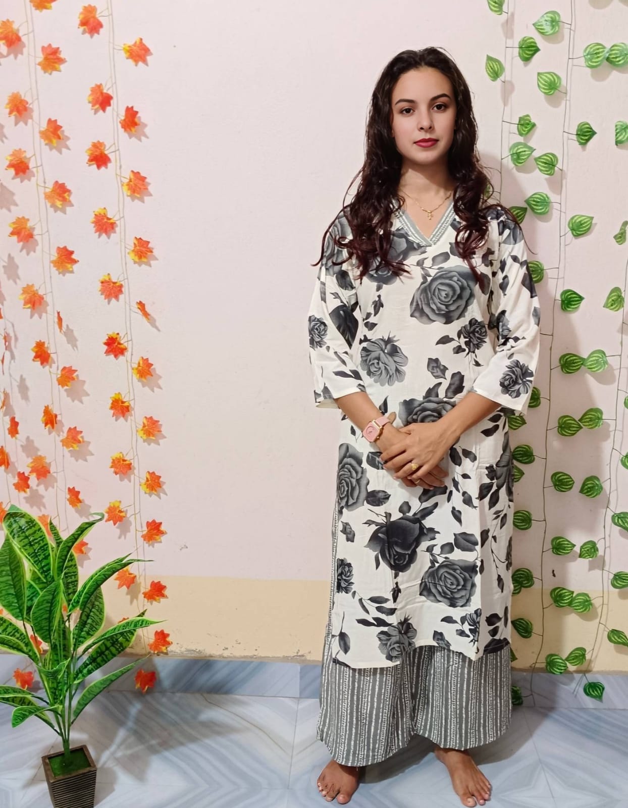 This Tunic Pant Co-ord Set combines comfort and style into one versatile outfit. The set features a long, straight-fit tunic with a V-neckline and three-quarter sleeves, designed with bold floral prints that add a vibrant touch. Paired with coordinating wide-leg pant, this set is made from soft, breathable fabric that ensures all-day comfort. Perfect for casual wear, lounging, or semi-formal occasions, it offers an effortless, coordinated look with the flexibility to mix and match with other wardrobe pieces. The set makes a chic and stylish addition to any ethnic or fusion wear collection. Hand wash recommended for maintaining quality and color vibrancy.